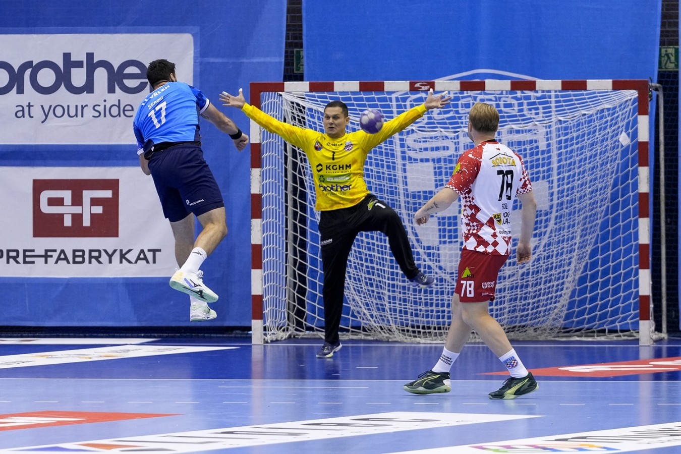 Mecz rozpoczął się zgodnie z oczekiwaniami, ale niekoniecznie po myśli faworytów. Gospodarze, naładowani pozytywną energią, nawiązali walkę. Przez pierwsze piętnaście minut na tablicy wyników panowała absolutna równowaga. Chrobry odpowiadał na każdą bramkę Wisły, a kibice oglądali zacięty pojedynek, w którym obie drużyny notowały wysoką skuteczność rzutową. W bramce głogowian świetnie spisywał się Rafał Stachera, który w pierwszej części dwukrotnie obronił rzuty karne i zatrzymywał m.in. groźne próby Melvyna Richardsona i Zoltana Fazekasa, nie pozwalając Nafciarzom na odskoczenie. Pierwsze prowadzenie trzema golami 13:10 goście osiągnęli dopiero w 20. minucie po trafieniu Michała Daszka. Chwilę później doszło do kluczowego i kontrowersyjnego momentu – Susnja popełnił faul na Mateuszu Orpiku, atakującym w kontrze bramkę gości i sędziowie pokazali płockiemu obrońcy bezpośrednią czerwoną kartkę. Nafciarze zaliczyli sześciominutową niemoc strzelecką pod koniec pierwszej części gry, co wykorzystali gospodarze i zdołali się zbliżyć do gości. Na przerwę Wisła schodziła z minimalnym prowadzeniem 15:14.