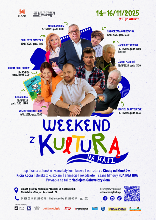 Sobota, 15 listopada, to dzień pełen atrakcji, m.in. spotkanie z płocczanką, autorką powieści obyczajowych, Małgorzatą Garkowską o 12:00, warsztaty komiksowe dla młodzieży (13:30–15:30) oraz spotkanie autorskie online z płocczaninem Jackiem Ostrowskim (13:00–14:00). O 14:00 odbędzie się panel dyskusyjny „Falowanie i spadanie, czyli być albo nie być w świecie literatury” z udziałem m.in. debiutantki Karoliny Poniatowskiej i blogerki „Juszeski”. Na spotkanie autorskie z Arturem Andrusem o godz. 16:00 (dziennikarz, poeta, artysta kabaretowy, Mistrz Mowy Polskiej) obowiązują wejściówki, dostępne od 5 listopada w Mediatece. Wieczorem, o 18:30, zaplanowano „Prywatkę na Fali z Maciejem Gabryelczykiem”. Najmłodsi będą mogli wziąć udział w wyjątkowym spotkaniu z bohaterką serii – Kicią Kocią (11:00–12:30 oraz 13:00–14:30) w Gmachu Głównym Książnicy Płockiej, ul. Kościuszki 6, obowiązują zapisy.