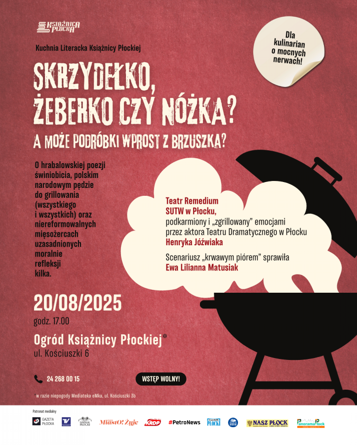 O hrabalowskiej poezji świniobicia, polskim narodowym pędzie do grillowania (wszystkiego i wszystkich) oraz niereformowalnych mięsożercach uzasadnionych moralnie refleksji kilka. Bez poprawności politycznej, ale i bez nadmiernej ekstazy, prowokacyjnie, obrazoburczo i przewrotnie z tematem zmierzy się Teatr Remedium SUTW w Płocku, podkarmiony i „zgrillowany” emocjami przez aktora Teatru Dramatycznego w Płocku Henryka Jóźwiaka. Scenariusz „krwawym piórem” sprawiła Ewa Lilianna Matusiak”.